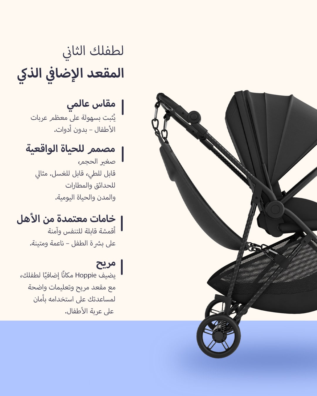 Hoppie adds an extra riding spot for your child, with a cozy seat and clear instructions to help you use it safely on your stroller.