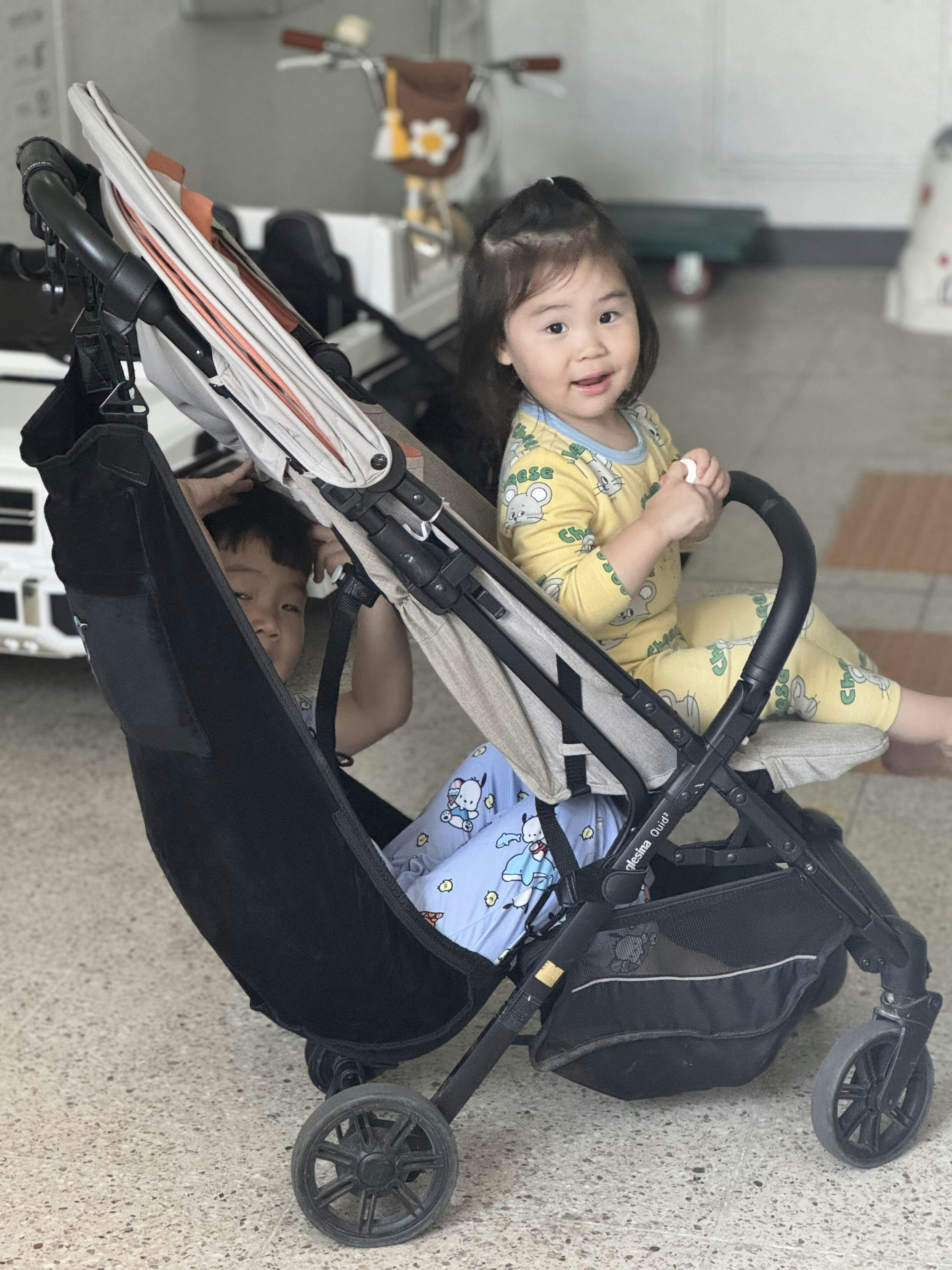 Hoppie est compatible avec la plupart des poussettes grand format et de voyage qui ont une barre de cadre arrière ou des poignées arrière solides.