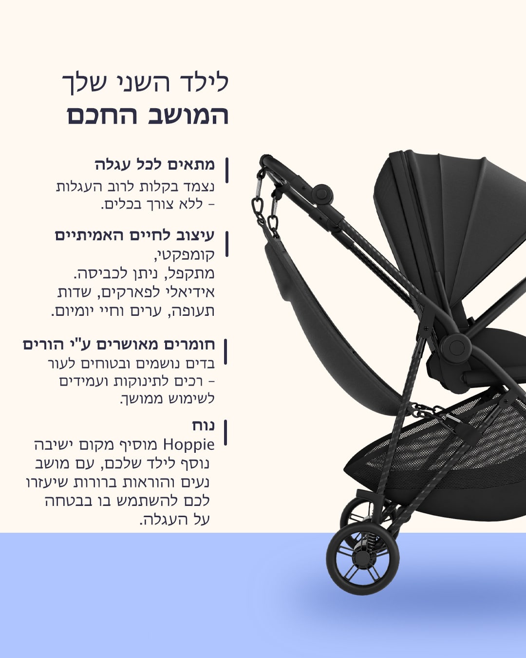 הופי מוסיף מקום רכיבה נוסף לילד שלך, עם מושב נוח והוראות ברורות שיעזרו לך להשתמש בו בבטחה בעגלת התינוק שלך.
