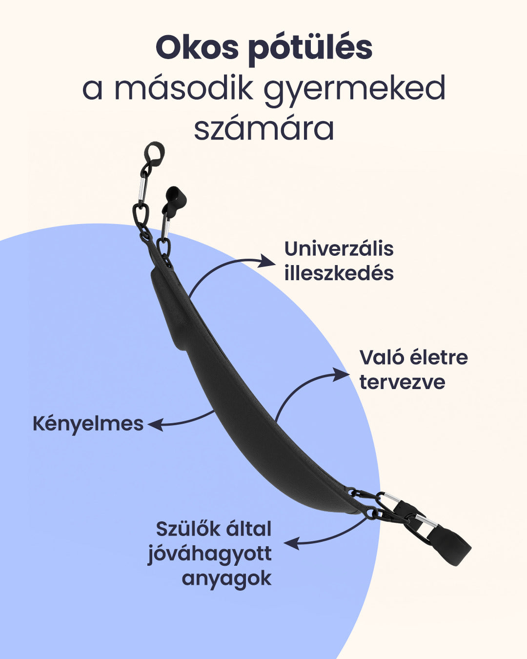 A Hoppie egy csiptetős, függőágy-stílusú ülőke, amelyet a legtöbb babakocsi hátuljára lehet rögzíteni. Biztonságos, kényelmes helyet biztosít az idősebb gyermekednek (18 hónapos kortól 4 éves korig), hogy leüljön és pihenjen — így nincs szükség nagy helyigényű ikerbabakocsira.