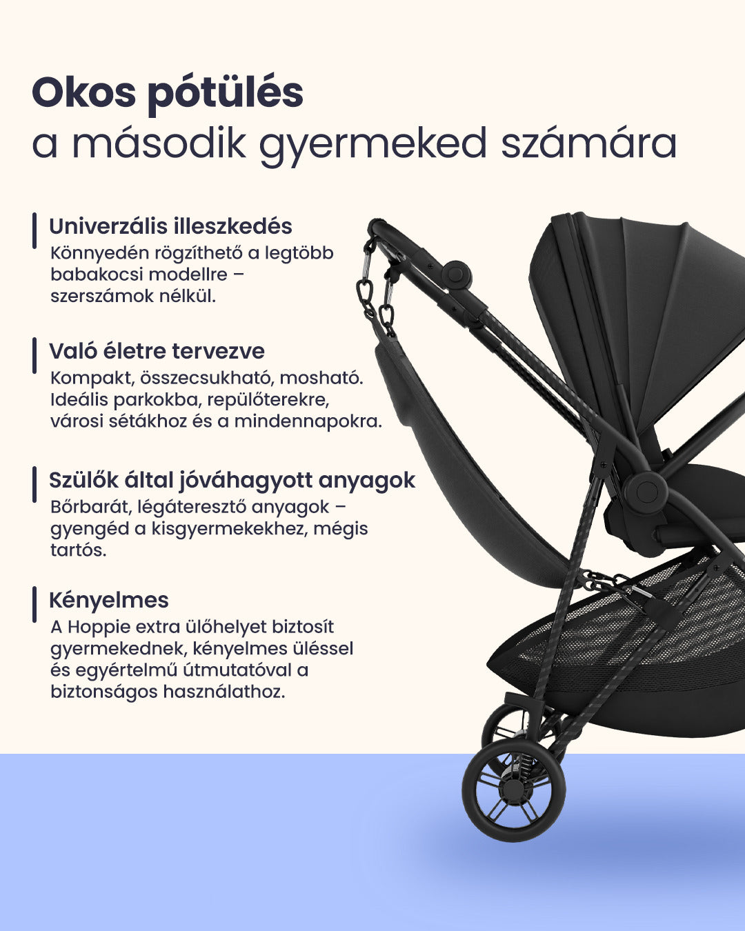 A Hoppie egy plusz ülőhelyet biztosít gyermekednek, kényelmes üléssel és világos útmutatóval, hogy biztonságosan használhasd a babakocsidon.