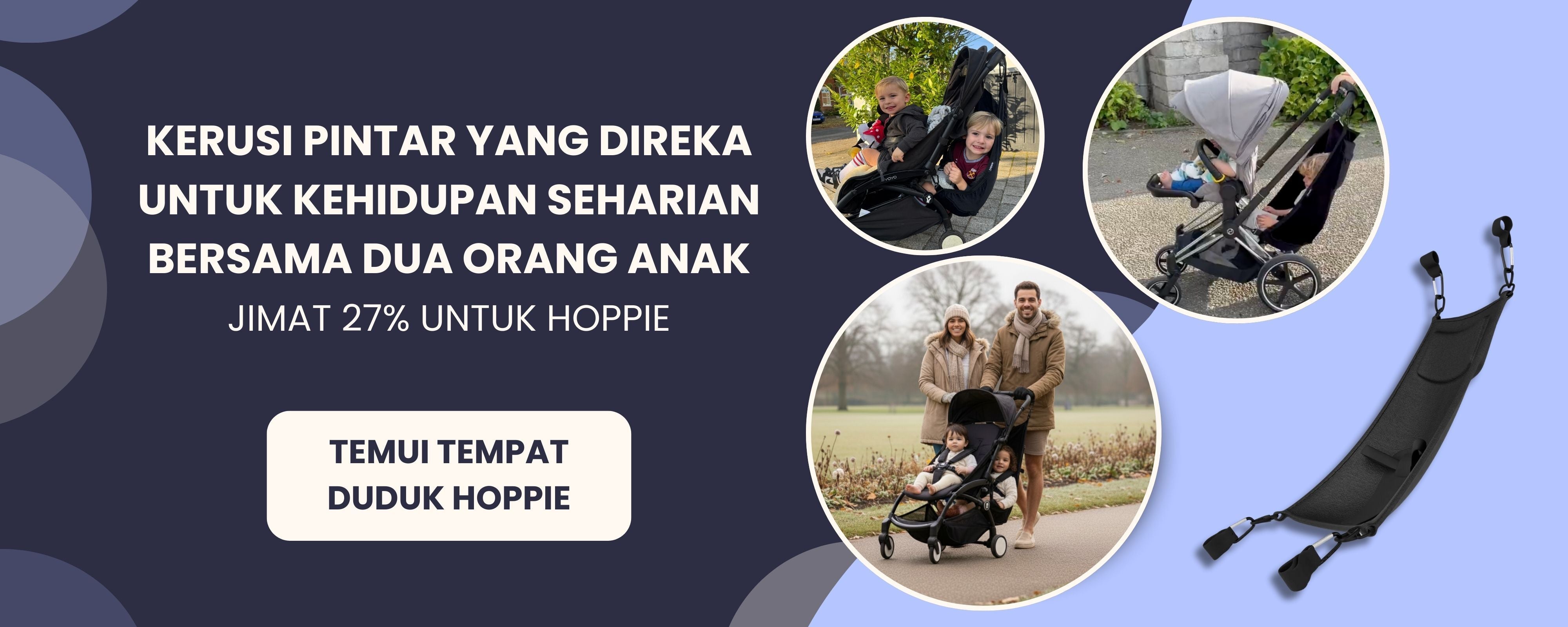 Hoppie adalah tempat duduk gaya buaian yang dipasang dengan klip direka untuk dipasang di belakang kebanyakan kereta sorong. Ia mewujudkan tempat yang selamat dan selesa untuk anak yang lebih tua (18 bulan hingga 4 tahun) duduk dan berehat — tiada keperluan untuk kereta sorong berkembar yang besar.