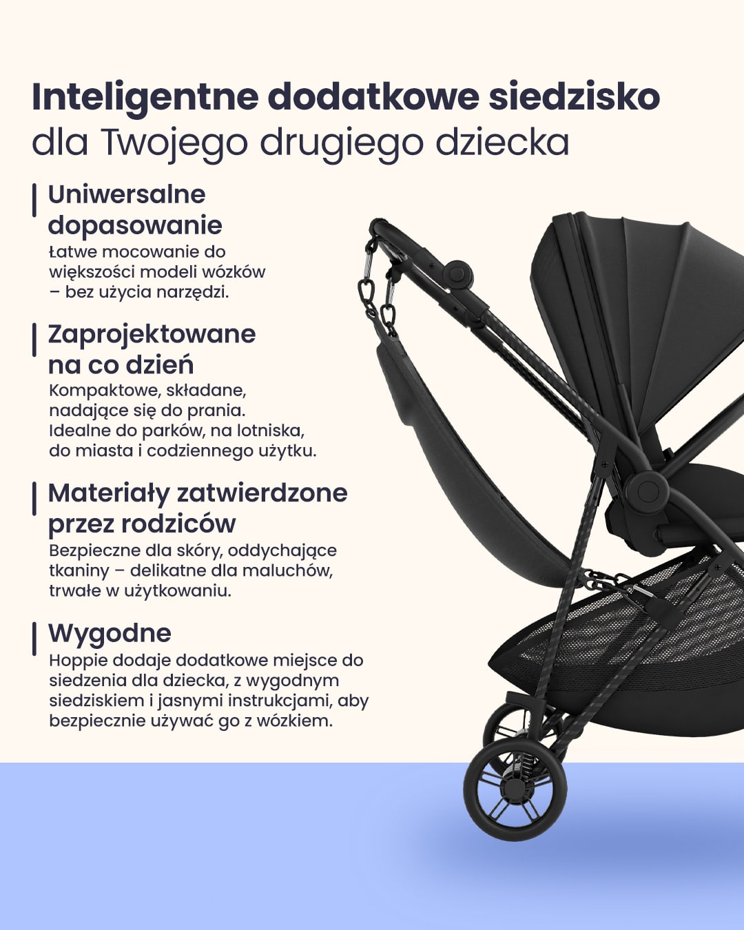 Hoppie dodaje dodatkowe miejsce do jazdy dla Twojego dziecka, z wygodnym siedzeniem i jasnymi instrukcjami, które pomogą Ci bezpiecznie go używać na Twoim wózku.