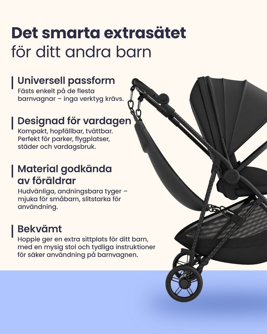 Hoppie lägger till en extra sittplats för ditt barn, med en mysig stol och tydliga instruktioner för att hjälpa dig använda den säkert på din barnvagn.