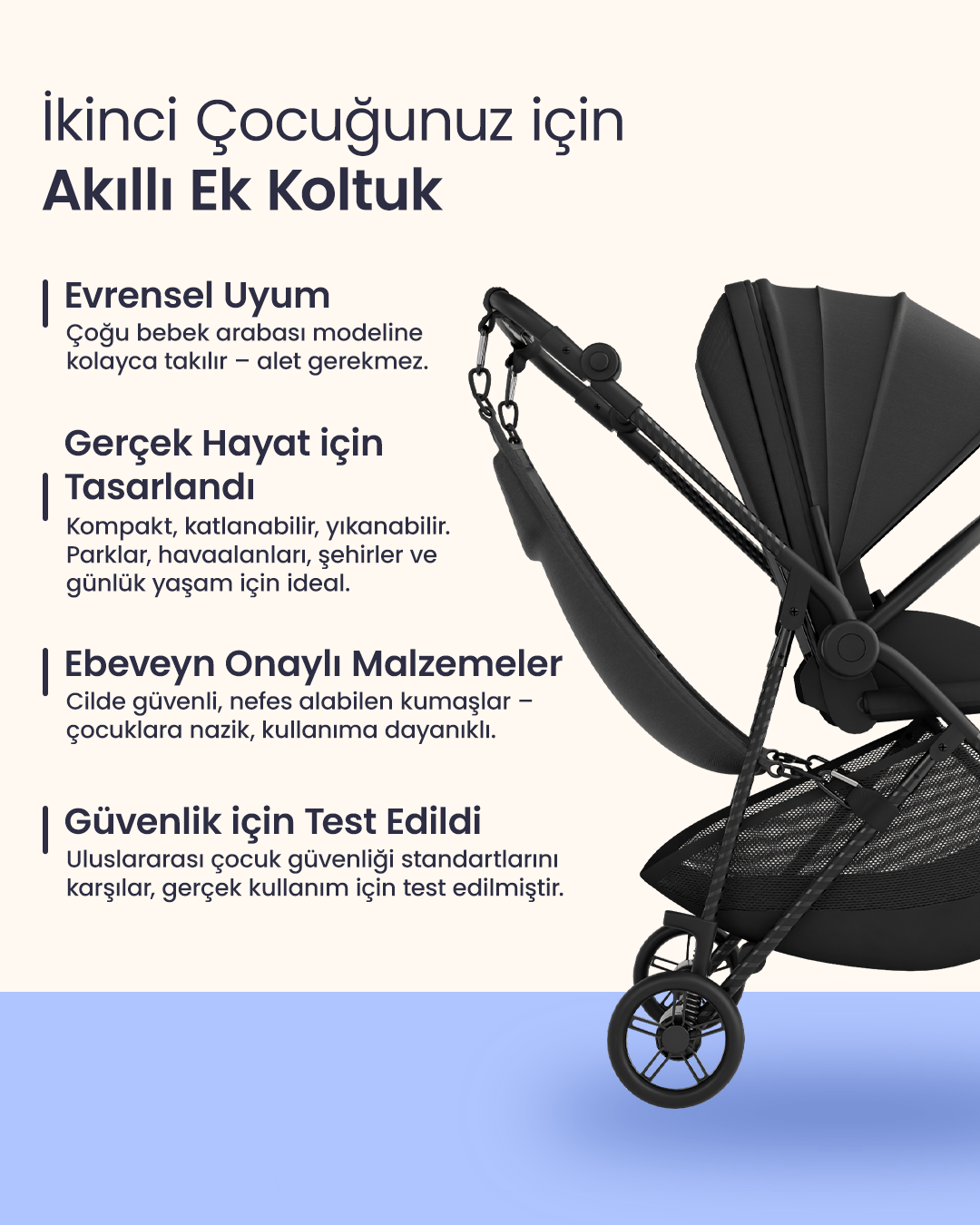 • Hafif ve kompakt – Pusetenizi saniyeler içinde çift kişilik hale getirir
