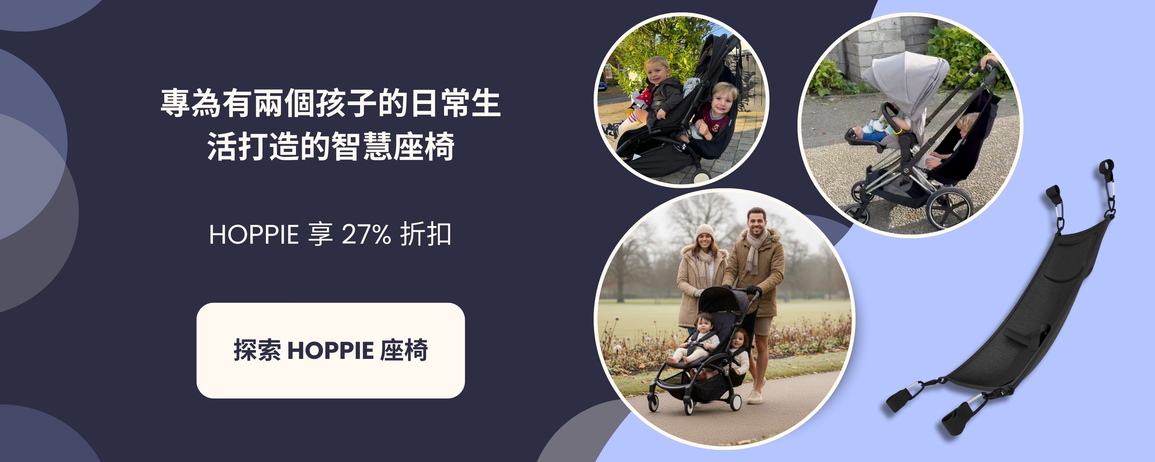 Hoppie 是一款 夾式吊床式座椅,設計用於固定在大多數嬰兒車的後方。它為您的 較大孩子(18 個月到 4 歲) 創造一個安全、舒適的坐臥空間 — 無需笨重的雙人嬰兒車。